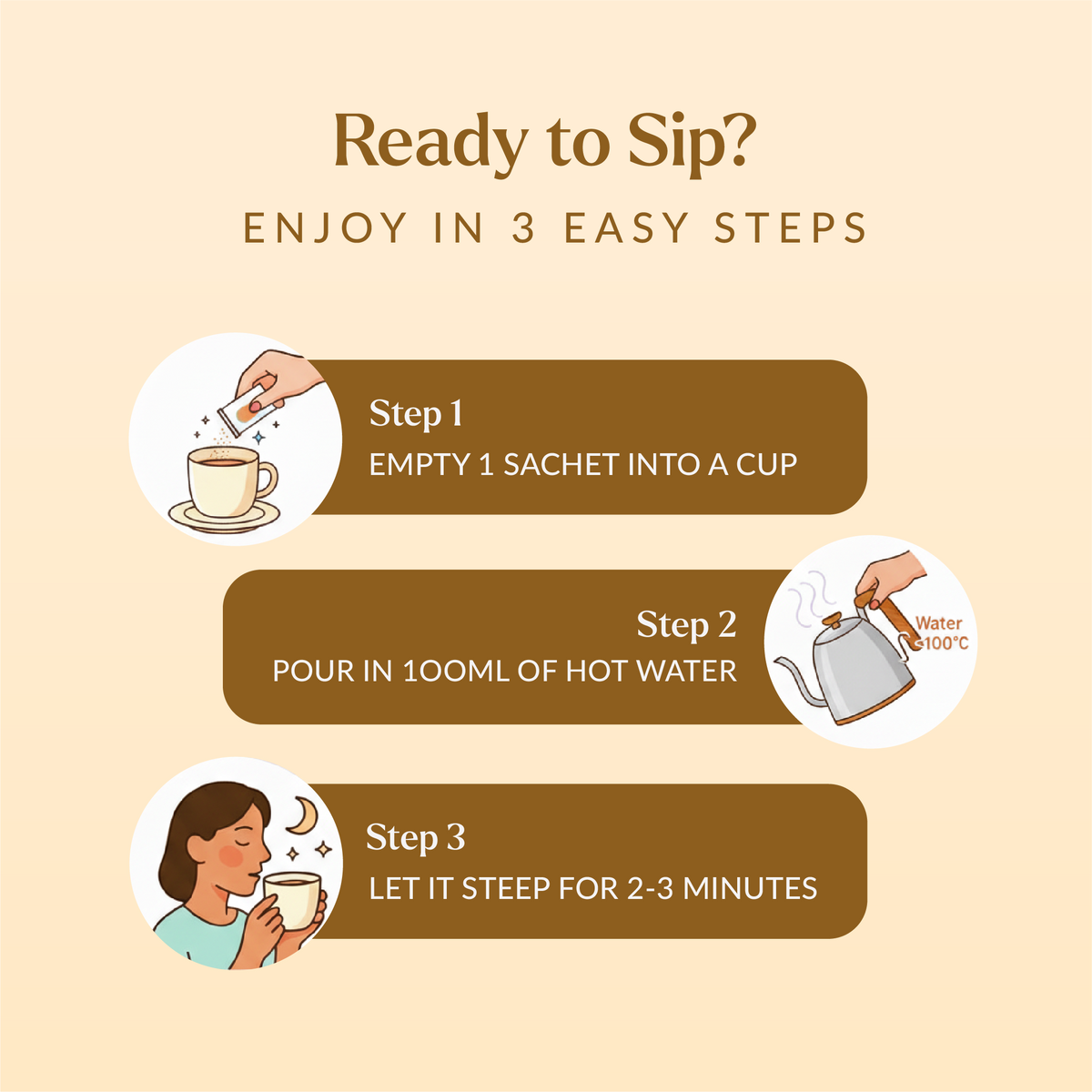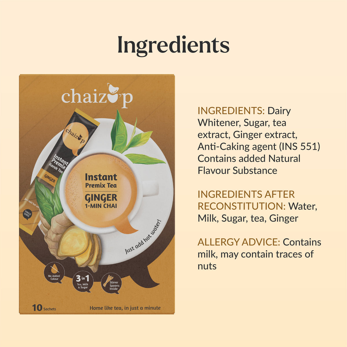 Empty one sachet into a cup, pour ~100 ml of hot water (just boiled), stir well until smooth & creamy. Enjoy immediately for the full ginger aroma and full kadak (strong) taste.