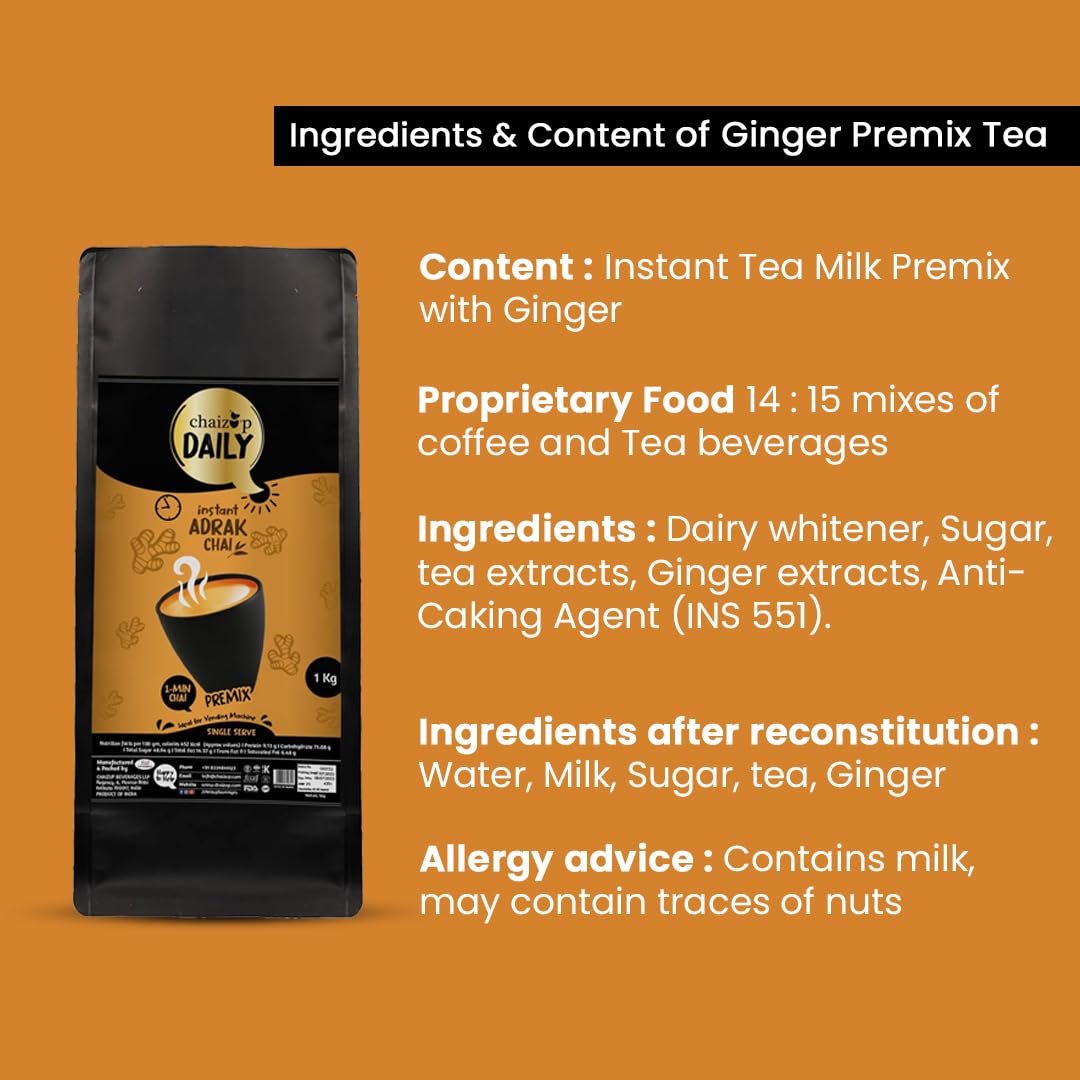 Chaizup Daily 1 Min Instant Adrak Tea Premix - 1kg Poly | Adrak Flavours | Approx. 72 Servings | 1kg
