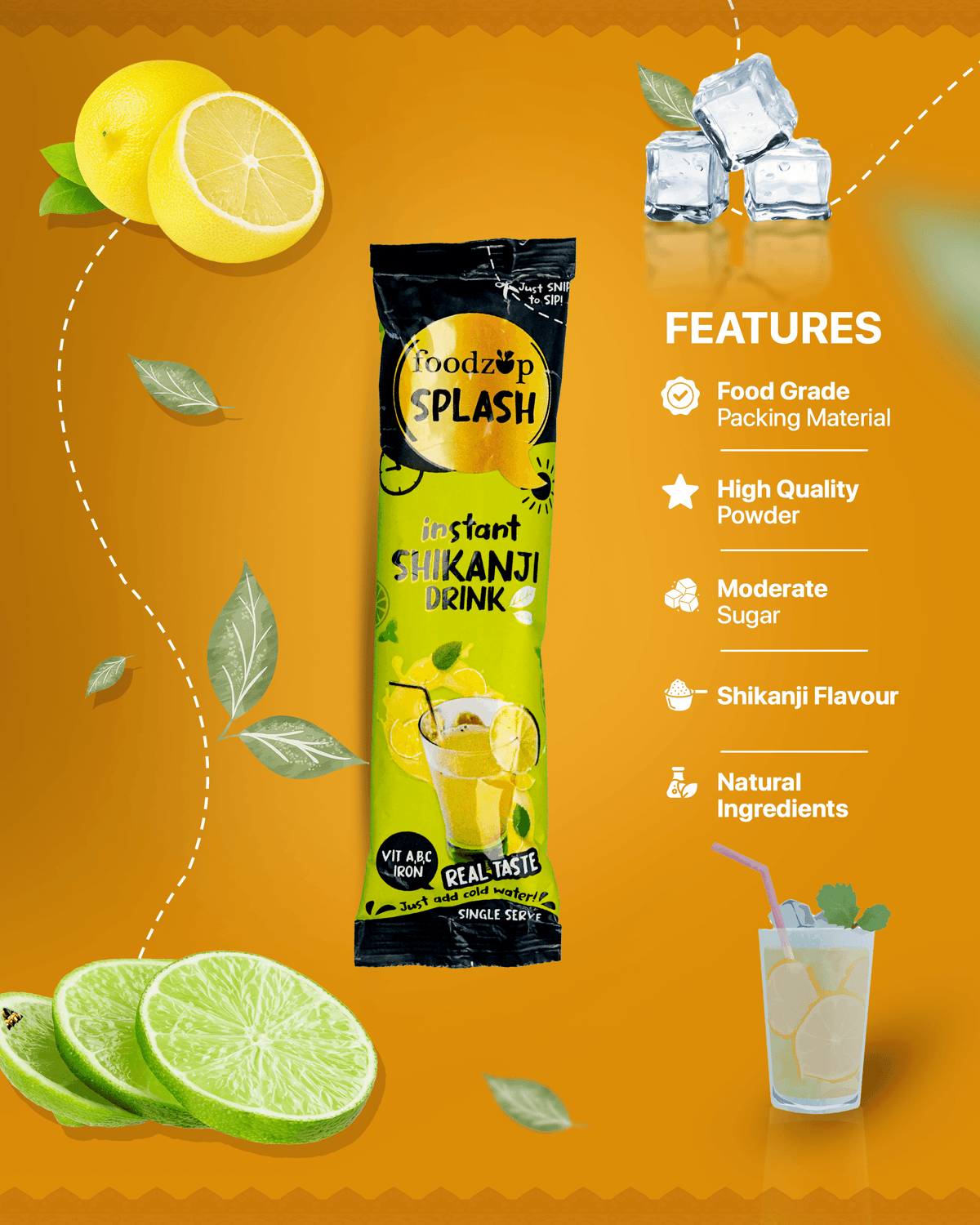Foodzup Splash 1 Min Instant Shikanji Fruit Drink - 30 Sachets | Shikanji Flavours | 30 Servings | 660g